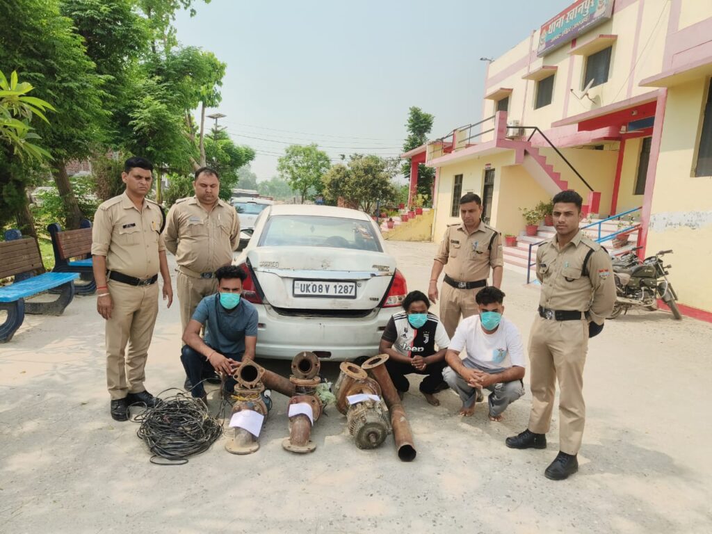 मिली जानकारी के अनुसार बीते 8 अप्रैल को प्रविन्द्र कुमार पुत्र भोपाल सिंह निवासी ग्राम प्रह्लादपुर द्वारा थाना खानपुर में तहरीर देकर बताया गया था कि 7-8 अप्रैल की रात अज्ञात चोरों ने उनके व अन्य किसानों के खेतो से पानी की मोटर व तार चोरी कर ली है। जिससे किसानों को काफी परेशानी हो रही है। मामले में पुलिस ने मुकदमा दर्ज कर चोरों की तलाश शुरू कर दी गयी। चोरों की तलाश में जुटी पुलिस टीमों ने कड़ी मशक्कत के बाद शेरपुर बस अड्डे पुरकाजी मुजफ्फर नगर से स्थानीय नागरिकों व पुलिस की मदद से 3 आरोपियों को पकड़ लिया गया। सख्ती से पूछताछ करने पर आरोपियों के कब्जे से चोरी की गई 4 विद्युत पानी की मोटर व चोरी में घटना में प्रयुक्त मोटरसाइकिल व कार बरामद की गई है। गिरफ्तार चोरों के नाम लवप्रीत सिंह पुत्र कश्मीर सिंह निवासी ग्राम तुगलपुर थाना खानपुर, दविन्द्र सिंह पुत्र सुब्बा सिंह निवासी ग्राम तुगलपुर थाना खानपुर जनपद हरिद्वार व दविन्द्र सिंह पुत्र साहब सिह निवासी ग्राम बढ़ीवाला थाना पुरकाजी उत्तर प्रदेश बताये जा रहे है।